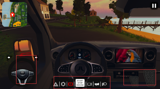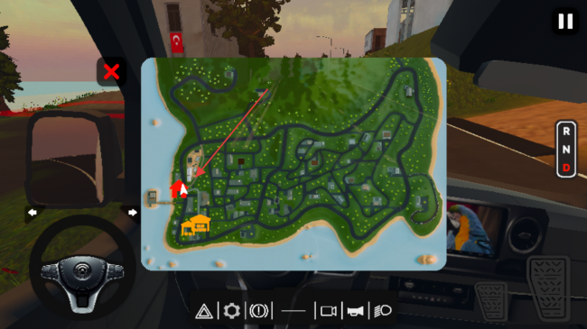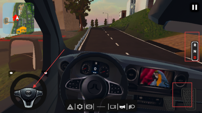 3、啟動車輛后,操控方向盤調整行駛方向,利用右側踏板控制車速,根據左側小地圖指引,行駛在道路上。