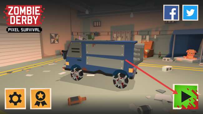 1、游戲初始界面,點擊綠色帶三角的按鈕,進入《ZOMBIE-DERBY-PIXEL-SURVIVAL》游戲,開啟僵尸德比像素生存之旅。