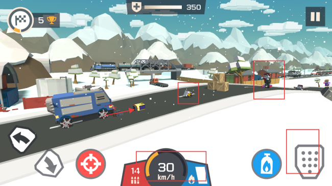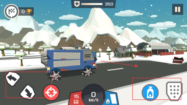 3、行駛過程中,根據情況點擊右側武器按鈕,攻擊障礙物或敵人,同時利用左側方向按鈕調整車輛行駛方向。