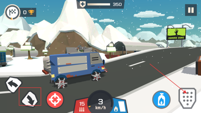 2、進入游戲場景,熟悉左側方向控制、射擊按鈕,右側燃油、武器按鈕。遇到僵尸時,可操控方向躲避或準備攻擊。