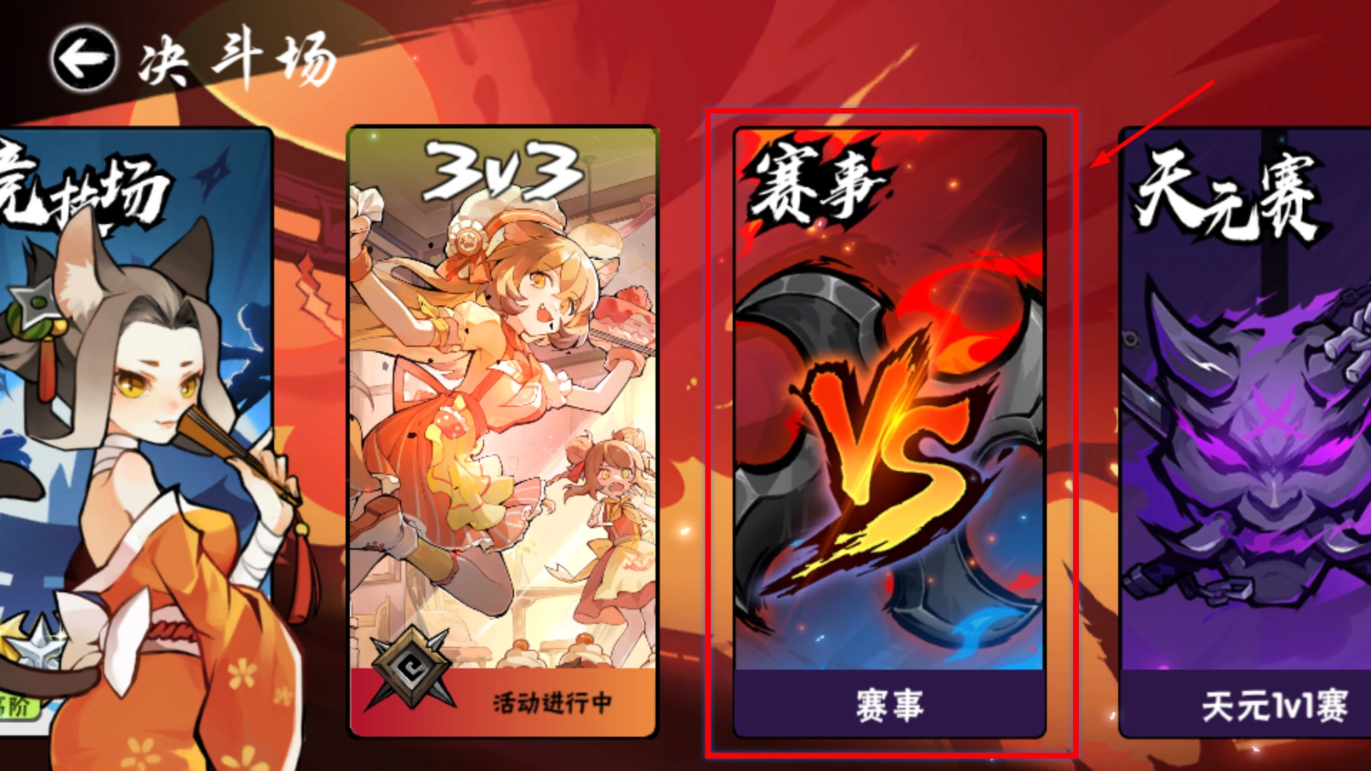 1、進入決斗場后選擇【賽事】板塊,查看【3v3】【天元賽】等模式,根據需求選合適賽事參與。