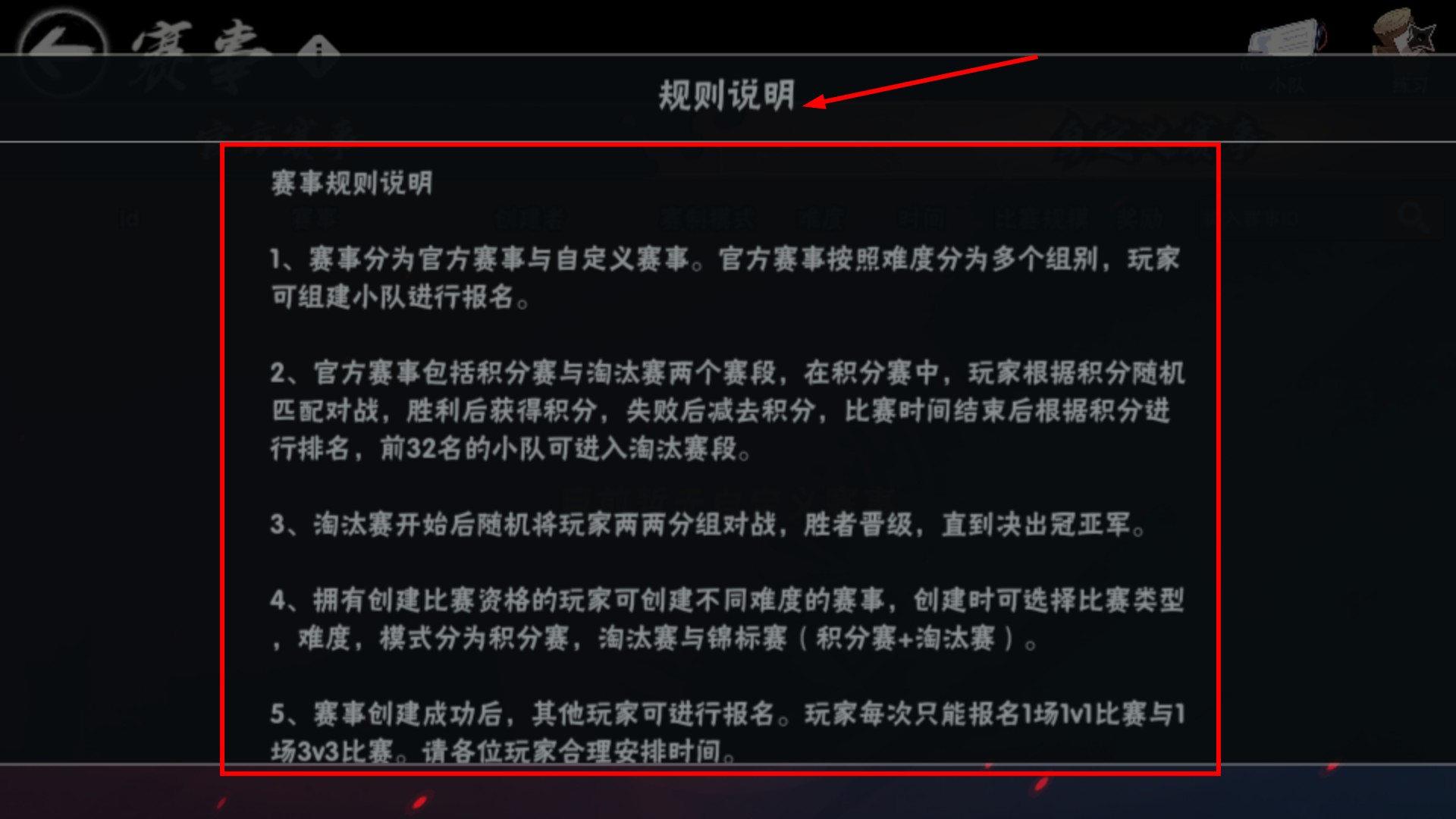 2、查看【規則說明】了解賽事分官方與自定義,積分賽攢積分晉級淘汰賽,注意報名次數限制。