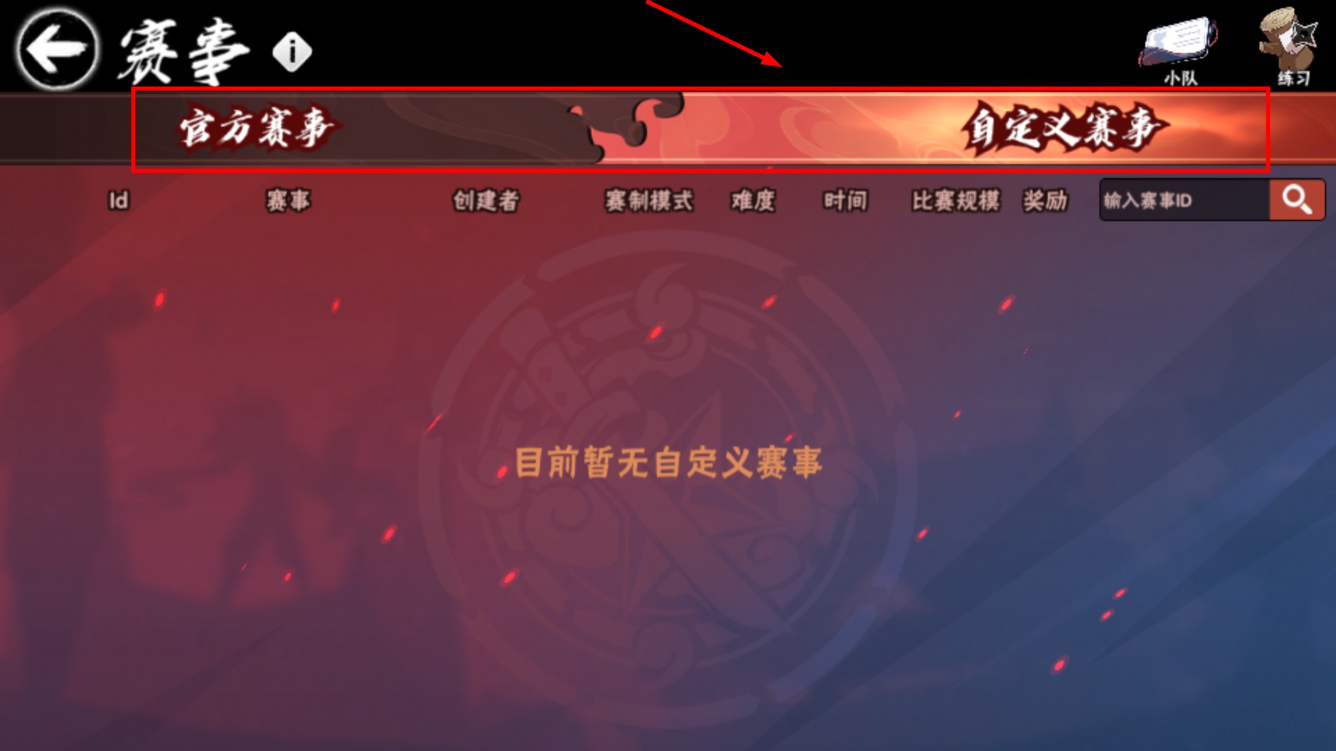 3、在賽事界面切換【官方賽事】標簽,若暫無自定義賽事,可輸入賽事ID搜索或等更新。