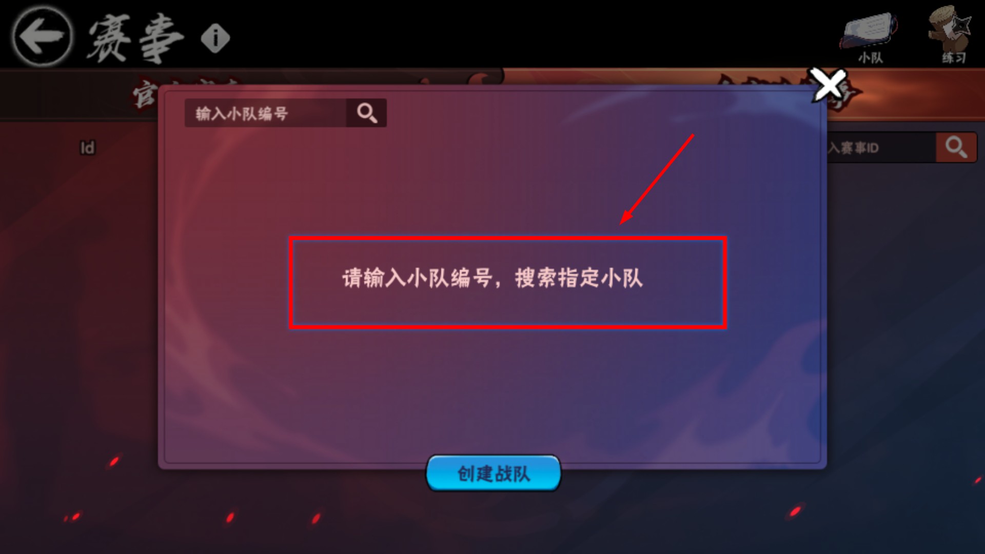 4、輸入【小隊編號】搜索指定隊伍,若未找到可點擊【創建戰隊】按鈕,組建隊伍參賽。