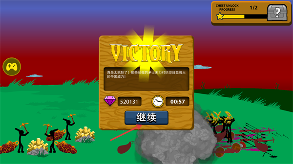 3、獲勝后出現(xiàn)【VICTORY】提示,點(diǎn)擊【繼續(xù)】按鈕,可獲得【520131】鉆石等通關(guān)獎(jiǎng)勵(lì)。